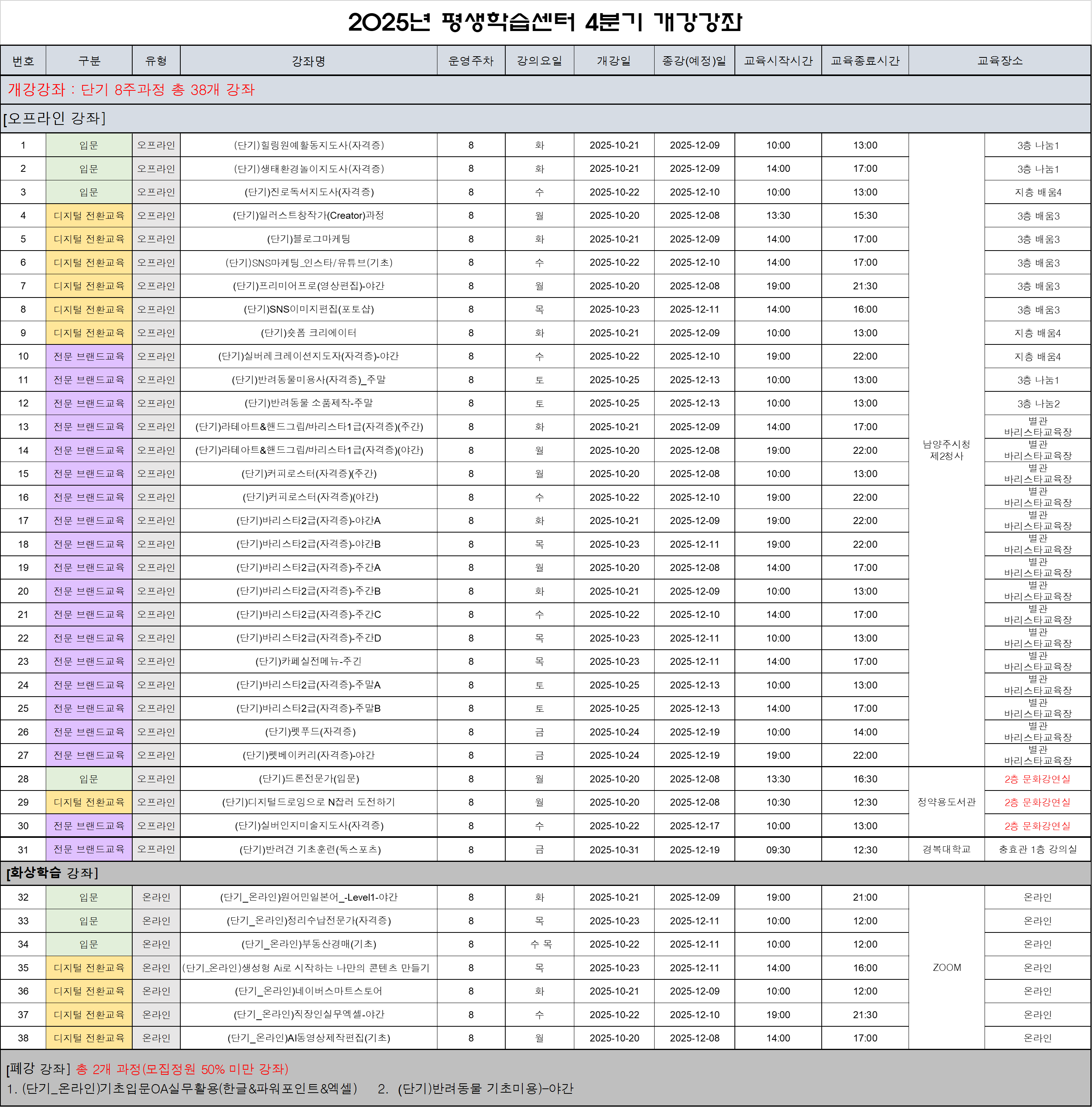 ㅇ 개 강 일 : 2025. 10. 20.(월)부터 개강 (단기과정 8주- 총 38개 강좌)